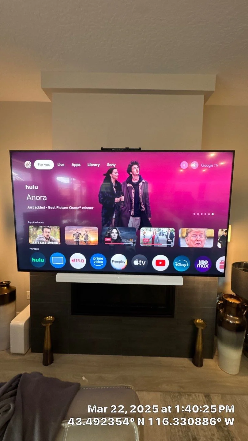 This comprehensive TV mounting and audio installation project seamlessly transitioned a repeat customer from Eagle to their new home in Kuna, Idaho. Our team expertly removed and transported five existing TVs, mounting them in multiple rooms—including the living room, office, master suite, patio, and guest rooms—using premium, professionally rated TV mounts. A standout feature is the living room's installation of a new 75” TV, which was paired with a Sonos soundbar and installed on a MantelMount motorized mount for full, motor-assisted motion and perfect viewing angles. Additionally, both indoor and outdoor audio-visual needs were addressed, including consultations for optimal soundbar placement and wire management to ensure a clean and modern look. Each area was carefully assessed for wall type, TV size, and viewing preferences, resulting in a custom, secure mounting solution that enhances both entertainment and aesthetic appeal. The project reflects our dedication to quality, expert workmanship, and customer satisfaction, ensuring an elevated home entertainment experience.
